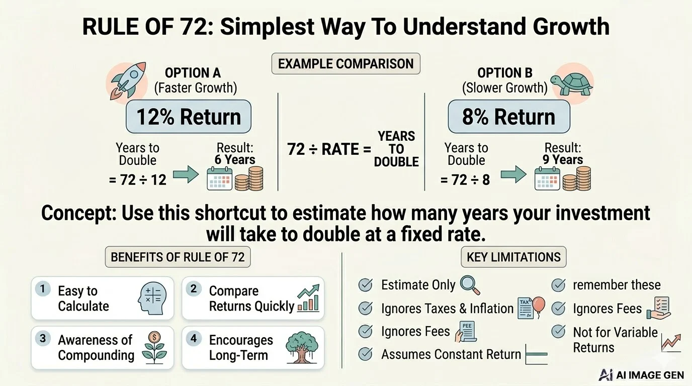 Rule of 72 is a simple and powerful tool that helps you understand how quickly your money can grow through compounding. It gives you a quick estimate of how many years it will take for your investment to double at a fixed rate of return. Instead of using complex formulas, you can use this shortcut to make faster financial decisions.
