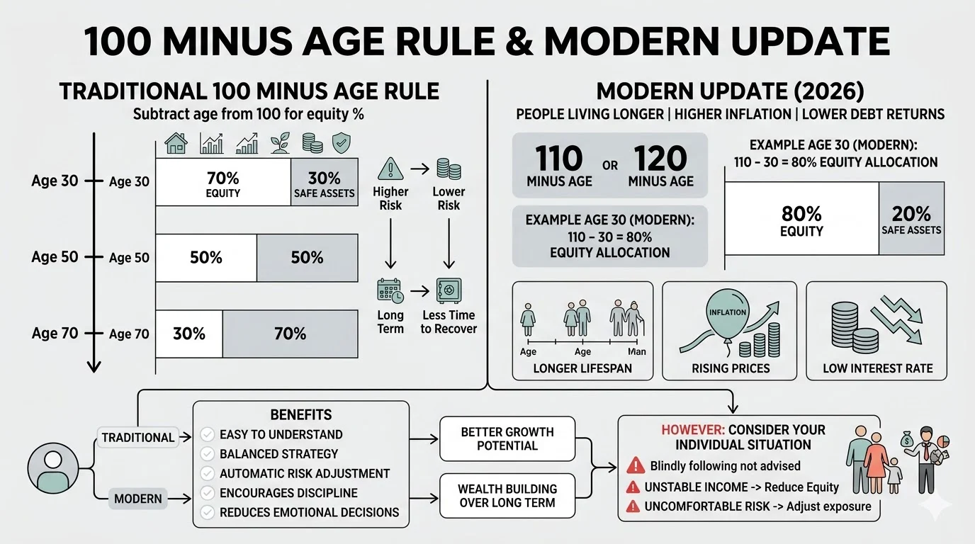However, in 2026, this rule is evolving. People are living longer, inflation is higher, and traditional debt investments are offering lower returns. Because of this, many financial experts now suggest using 110 or even 120 minus age for better growth potential. For instance, if you are 30, using 110 minus 30 gives you 80 percent allocation to equity, which can help you build more wealth over the long term.