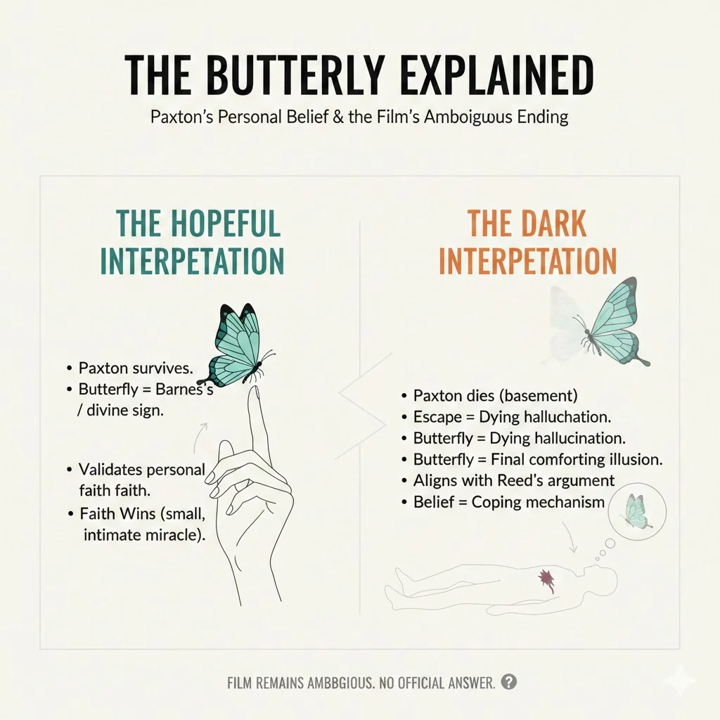 Paxton survives. The butterfly represents Sister Barnes’ spirit or a divine sign. It validates personal faith. Reed argued that belief is illusion. But this moment suggests something beyond his control.