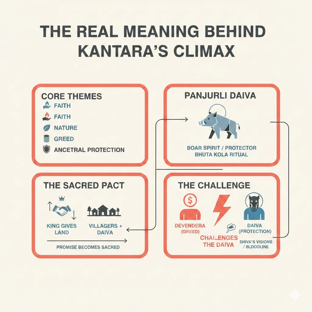 To understand the ending, we need to go back to the core theme of Kantara. This is not just a land dispute story. It is about faith, nature, greed and ancestral protection.