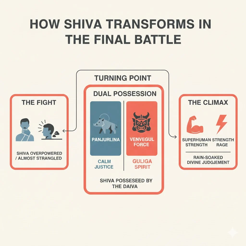 This dual possession explains Shiva’s extreme rage and superhuman strength. The rain soaked fight scene is not just action. It is divine judgment unfolding.